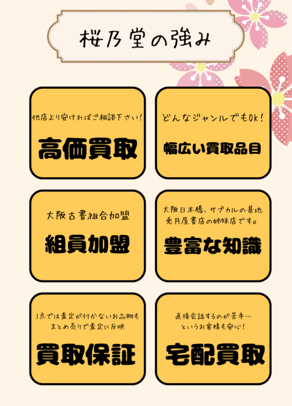 桜乃堂は大阪府を中心として活動を行っている買取専門店です。買取分野は年代を問わず古本やおもちゃ、ゲーム、DVD、CD、レコード、ポスター、セル画、ゲーム、成人向け商材まで。数多の分野で商品買取のご相談を承っております。