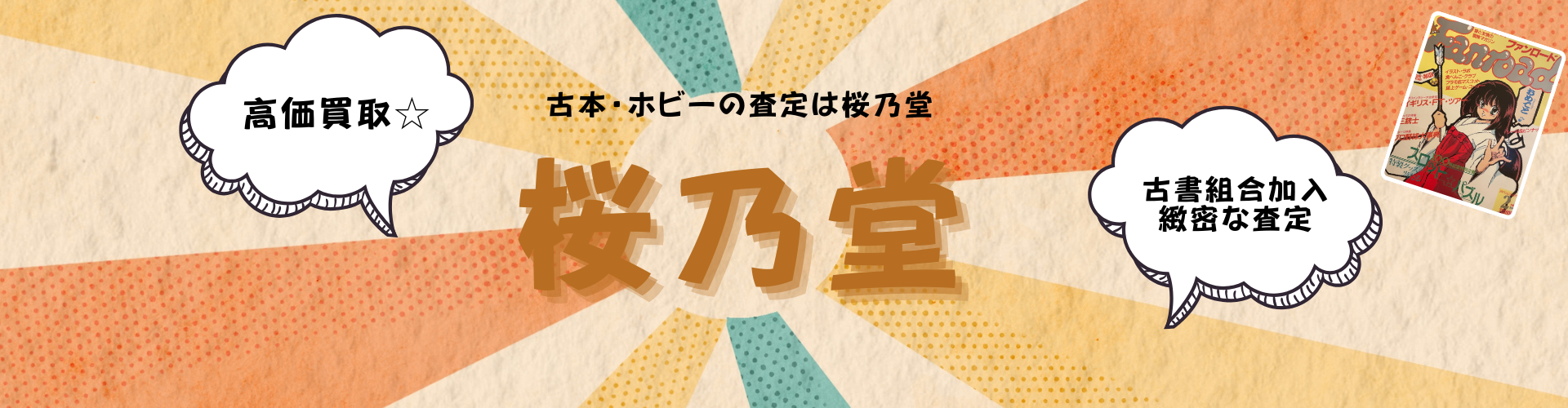 桜乃堂は大阪府の富田林を拠点に古書、レトログッズ等をはじめとした多方面にわたるサブカルチャーを取り扱う無店舗型買取専門店として開業いたしました。大阪古書組合が運営する業者市場へ仕入れに出向、即売会への参加、同業者様の古本屋のもとで6年間紆余曲折ありながら知識や経験を蓄え、現在に至ります。幼少期からサブカルチャーへの気質が高く、その領域を掘り進めておりました。